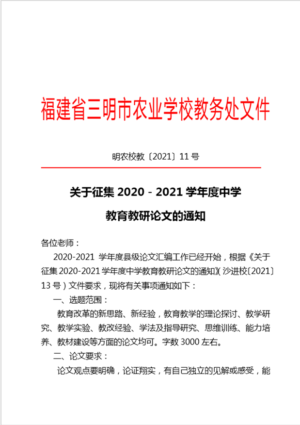 关于征集2020-2021学年度中学 教育教研论文的通知