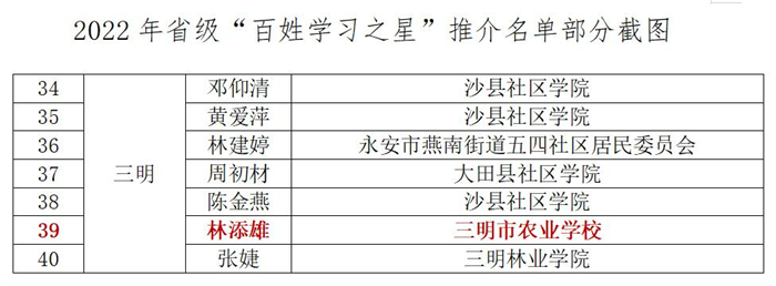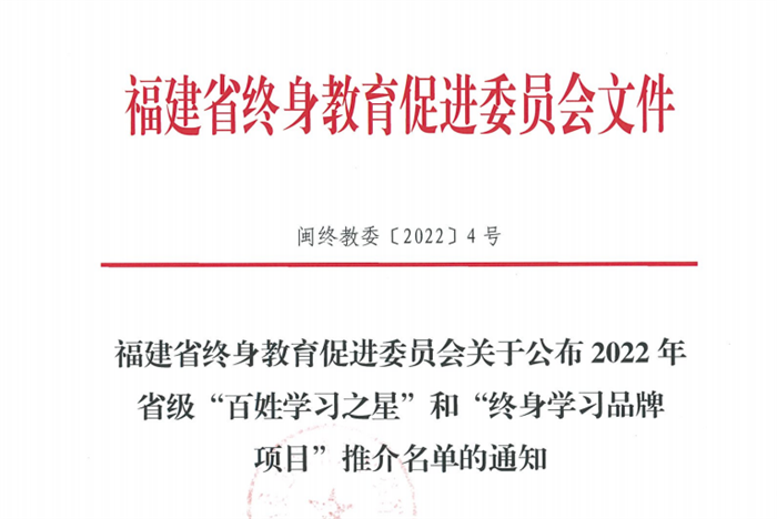 近日,福建省终身教育促进委员会印发《关于公布2022年省级“百姓学习之星”和“终身学习品牌项目”推介名单的通知》(闽终教委〔2022〕4号),确定58名同志作为省级“百姓学习之星”、42个项目作为省级“终身学习品牌项目”进行推介,我校推荐的林添雄老师入选“百姓学习之星”,选送的《“一体两冀四驱动”服务体系赋能乡村振兴》工作案例入选“终身学习品牌项目”。
