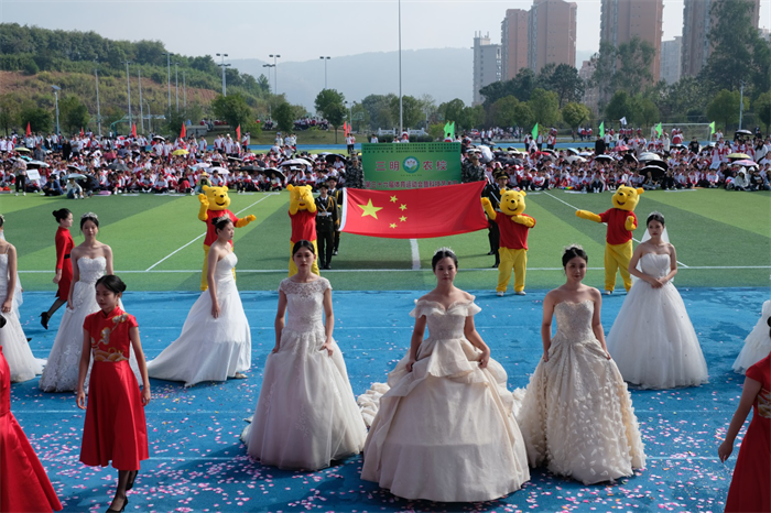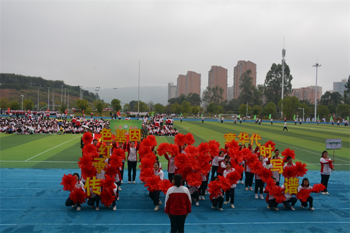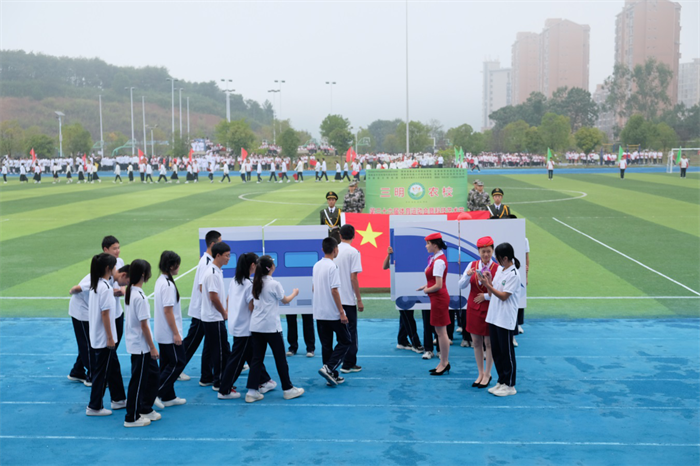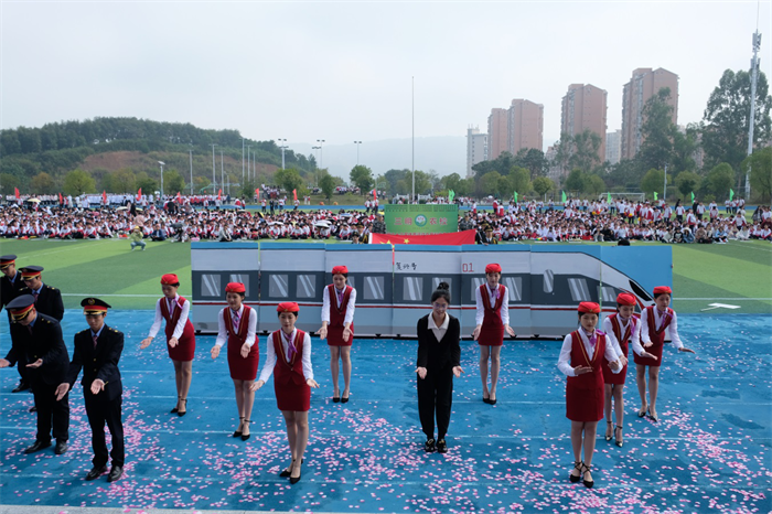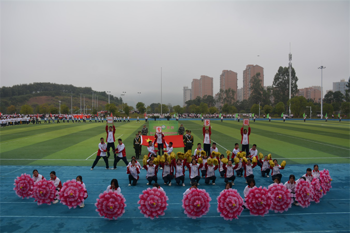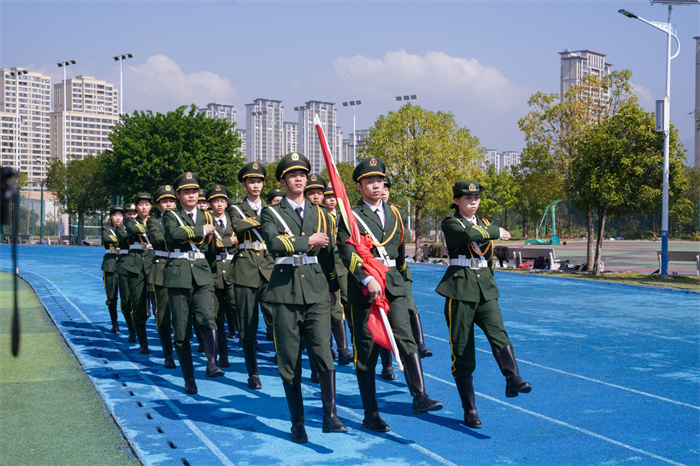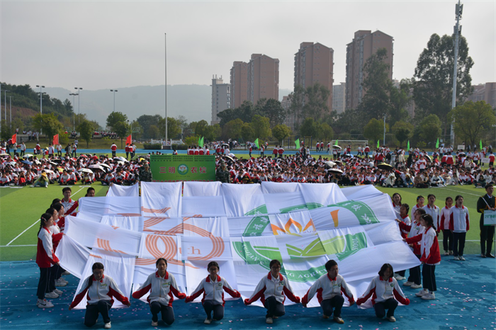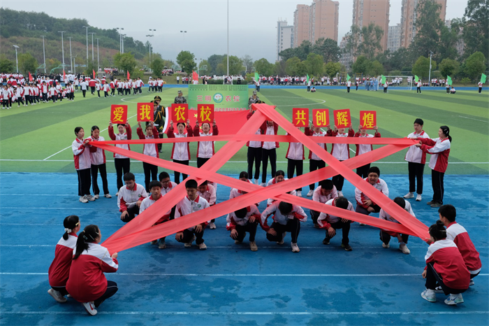 秋天的朝阳映照着青春的脸庞,飒爽的秋风轻抚着少年的衣角。伴随着激昂的旋律,国旗队、校徽队、彩旗队及97支由各班级组成的方队,迈着整齐的步伐,喊着响亮的口号依次走过主席台。他们昂首阔步、意气风发,在主席台前用各具特色、形式多样的表演展示班级文化、专业特色,展示农校人健康自信、积极进取的精神面貌,也展示了学校坚持五育并举、促进学生全面发展的育人成果。