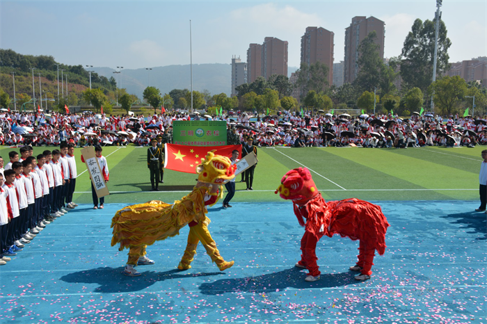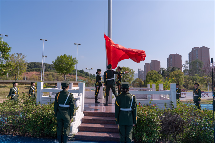 国旗队迈着整齐有力的步伐护送国旗入场。在雄壮的国歌声中,鲜艳的五星红旗冉冉升起,师生们全体肃立,注目国旗,向伟大祖国致以崇高敬意。