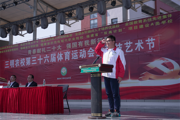 黄浩楠同学代表运动员宣誓,表示将遵守纪律、团结协作、勇于拼搏,奋力展现运动员的青春风采。